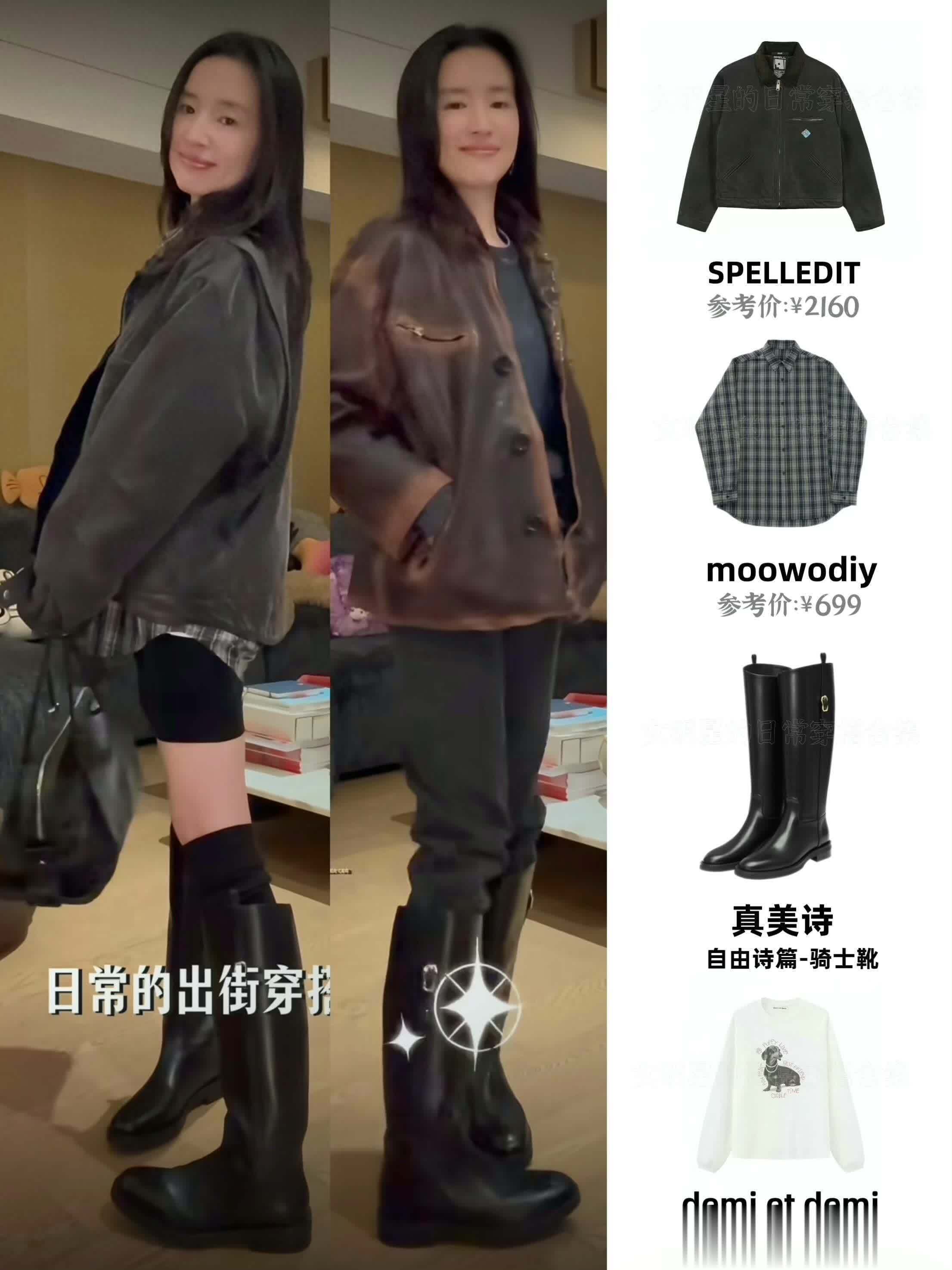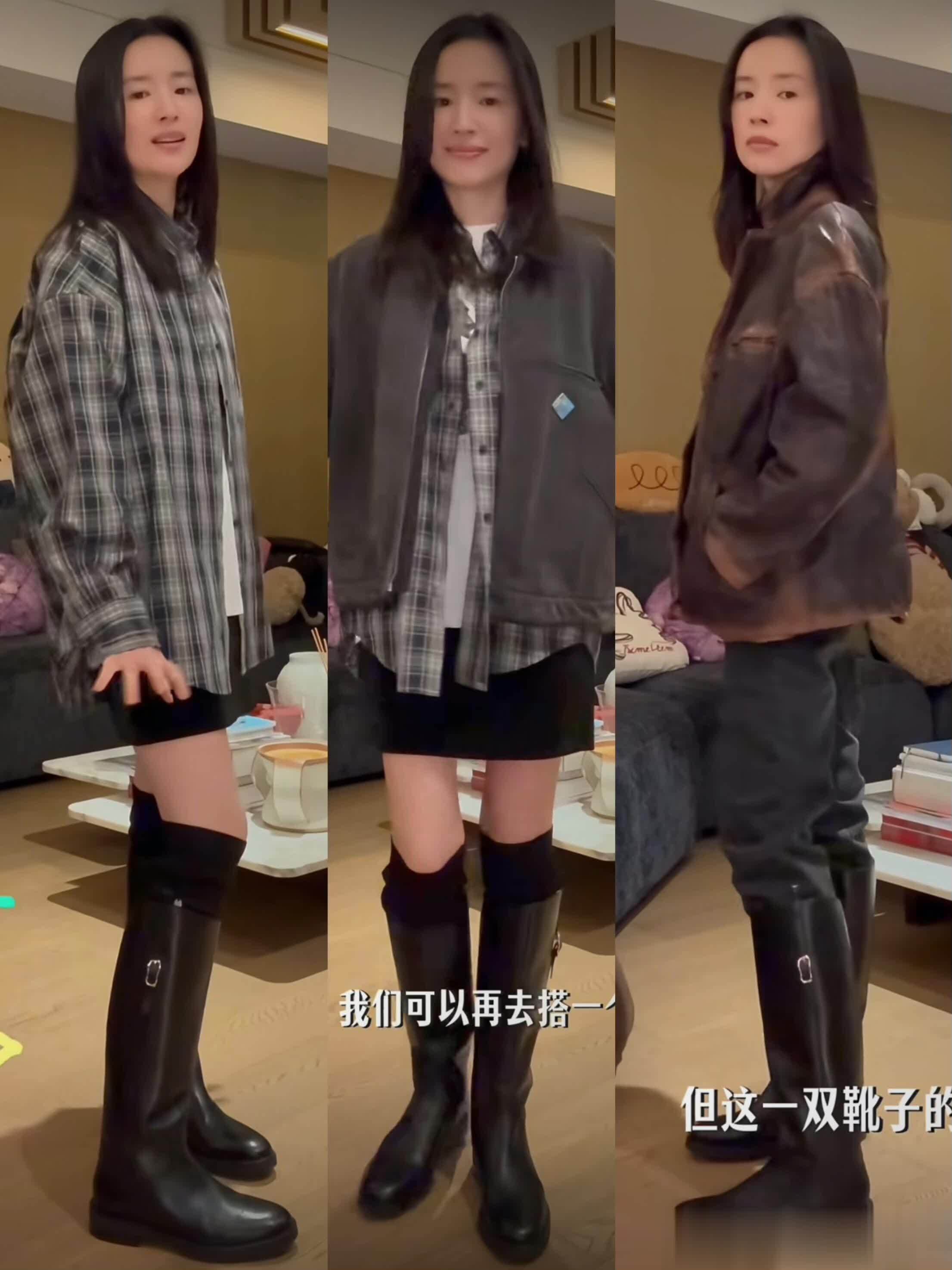 先看那套“灰色外套+格纹衬衫+黑长靴”,把“俏皮感”藏在细节里!灰色外套是那种软软的短款,版型不紧绷,搭在身上像裹了层暖乎乎的云朵,里面叠穿的格纹衬衫是红绿细格,领口和袖口悄悄露出来一点,瞬间打破灰色的沉闷,不会显得老气。下半身看不清具体穿了啥,但光看腿就知道是“小心机”——黑色长靴直接拉到膝盖下,靴筒紧紧裹着小腿,显得腿又细又直,裤脚大概是塞进靴子里了,利落得很。她把外套袖子挽了两圈,露出手腕上细细的手链,走起来带点晃悠的劲儿,像刚从街角咖啡馆出来的姐姐,去逛超市或者和朋友喝热饮穿,舒服又有精神,完全没有“明星摆拍”的紧绷感。